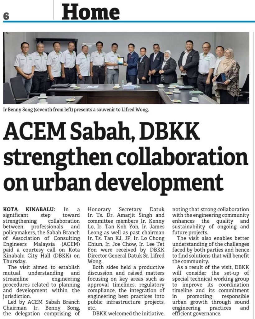 ACEM Sabah, led by Branch Chairman Ir. Benny Song, extended a courtesy call to Kota Kinabalu City Hall (DBKK) on the 4 September 2025. The delegation was formally received by DBKK Director General, Datuk Sr. Lifred Wong.